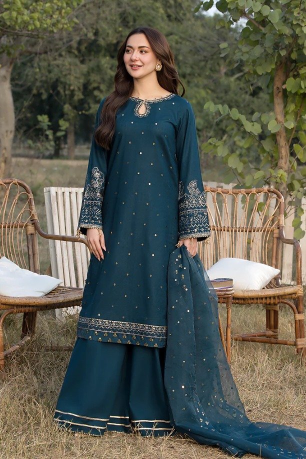 Qalamkar 3pcs Lawn Embroidered With Organza Emb Dupatta – 3090